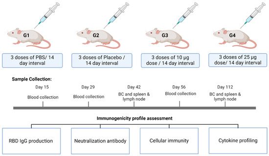 Study design to assess immunogenicity in mice. G1—Vehicle control; G-2—Placebo Control; G3—Low-dose; G4—High-dose. Created in BioRender.com.