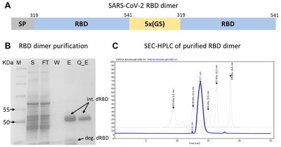Design of dimer RBD antigen and purification. (A) Schematic SARS-CoV-2 dimer RBD antigen diagram. (B) Purification of dimer RBD: M—molecular weight markers; S—the initial culture liquid; FT—the protein fraction not bound to the affinity sorbent; W—wash fraction with a buffer containing 40 mM imidazole; E—elution of the target fraction with a buffer containing 250 mM imidazole; Q_E—the elution of the target protein from the ion exchange column. (C) SEC-HPLC analysis of purified antigen. Blue line—Dimer RBD; Pale black lines—standard proteins.