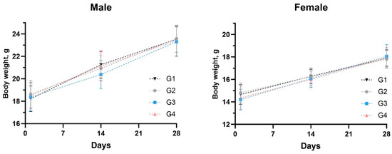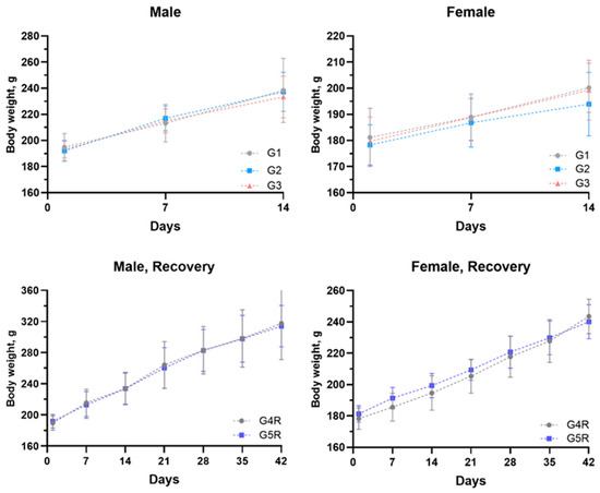 All animals survived throughout the experimental period, and no mortality was observed. No abnormal clinical signs were observed in any animal. After dose administration, local tolerance evaluation revealed no edema or erythema at the injection sites on any day of observation (Days 01, 14, and 28). All the animals gained body weight routinely throughout the experimental period. The body weights of all the treated males and females were comparable to those of control males and females (Figure 5).
