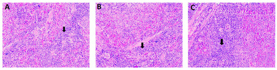 Formation of follicular cell hyperplasia (arrows). (A,B) in G3 males and (C) in G3 female.