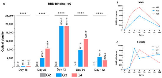 The animals in the vehicle group exhibited no substantial levels of anti-RBD IgG or neutralizing antibodies. Additionally, no statistically significant differences were observed between the placebo and vehicle control groups for any study experiment at any time. Thus, the PBS group was omitted from the given figures. First, the overall OD values were calculated for each group (Figure 6A), and fold change in geometric mean titers (GMTs) of treatment groups was calculated compared to the G2-placebo group. To do this, the average geometric mean titers were calculated for each animal in the treatment group and then divided by the placebo mean for each corresponding time point and sex. Interestingly, we noticed the male and female mice had varied responses to different vaccine doses (Figure 6B,C). For instance, the rise in GMT was directly proportional to the dose in males on all days except Day 112. In contrast, a 10 µg dose improved anti-IgG production in females at most time points. However, the t-test analysis revealed that the differences between G2 and G3 for both sexes were not statistically significant. Yet, the overall rise in GMT level in the G4 group between days 28 and 56 was significantly lower in female mice compared to their male counterparts for the same group. Antibody levels dramatically increased after the first and second booster doses (days 14 and 28) in both males and females. The antibody titer reached its increased peak on day 42 and reduced through day 56 till day 112 at both dose groups. In the case of low-dose females, the peak antibody titer achieved on day 42 was sustained for a prolonged period (up to day 112), suggesting an aggravated antibody response in females compared to males.