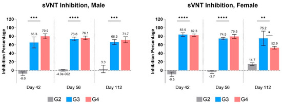 The neutralization results suggest that the antibodies produced after the vaccination could bind to and neutralize the SARS-CoV-2 antigen conjugate in both males and females at both dose levels (Figure 7). The control groups had no detectable antibodies and showed no significant inhibition, except for minor inhibition in both males and females on day 112. It has also been noticed that neutralizing antibodies are synthesized at slightly higher levels in G4 group male mice compared to G3 group mice. In the case of females, the G3 group had higher levels of NAbs on days 42 and 112, respectively, corresponding to the total anti-RBD IgG produced in female mice (Figure 6C). However, the changes in neutralizing antibody levels were not statistically significant between the G3 and G4 groups, except for female mice on day 112. Several factors might have contributed to the decrease in both specific RBD-binding IgG titers and neutralizing antibodies, high-dose group in comparison to low-dose group in females, including hormonal influences, or possible saturation effects at higher doses, leading to a regulatory feedback mechanism that could suppress antibody production.