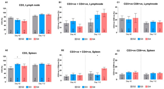 The cellular immune response against the RENOVAC vaccine was evaluated on days 42 and 112 to determine the vaccination’s post-acute and long-term effects on immune cell proliferation. Despite differences in IgG production, males and females exhibited similar trends in the percentage of cells analyzed; however, the response towards the vaccination slightly differed between lymph nodes and spleen. Thus, the values were grouped according to per organ. For example, the CD3+ve cell percentage in the treatment groups was significantly higher in the spleen for day 42, whereas in the lymph node, it showed a decreasing trend (Figure 8).