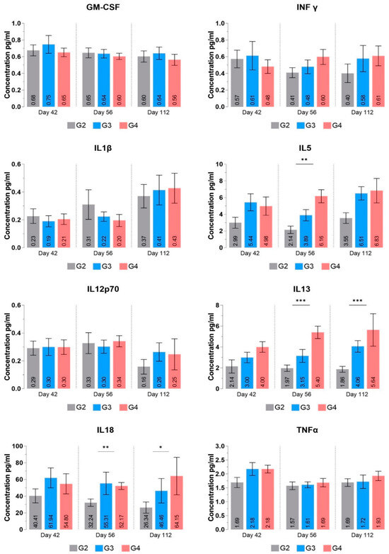 Concentrations of cytokines after the immunization. The values represent the mean ± SEM of all animals per group. p-values were analyzed with one-way ANOVA (* p < 0.05; ** p < 0.01; *** p < 0.001).