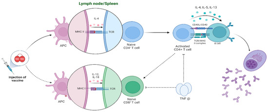 Briefly, the vaccine may act primarily through generating Th2 subpopulations due to CD4+ cell activation. These activated cells stimulate B lymphocytes to become antibody-producing plasma cells. Additionally, CD8+ T cells might also form via activation of Th1 lymphocytes or through cross-presentation of antigens by antigen-presenting cells. Furthermore, TNF-α or other immune-modulatory compounds produced from these stimuli can suppress the activated CD8+ and CD4+ cell populations to restrain excessive immune responses. The dominance of the Th2 response is advantageous for enhancing neutralizing antibody titers, which are vital for immediate protection. Nonetheless, the presence of a Th1 response is essential for viral clearance and sustained immunity [51]. While the strong Th2 response ensures effective antibody-mediated neutralization, the Th1 response, though less dominant, supports long-term immunity and helps clear the virus from the host. This multifaceted approach highlights the importance of a balanced immune response for both immediate and sustained protection.