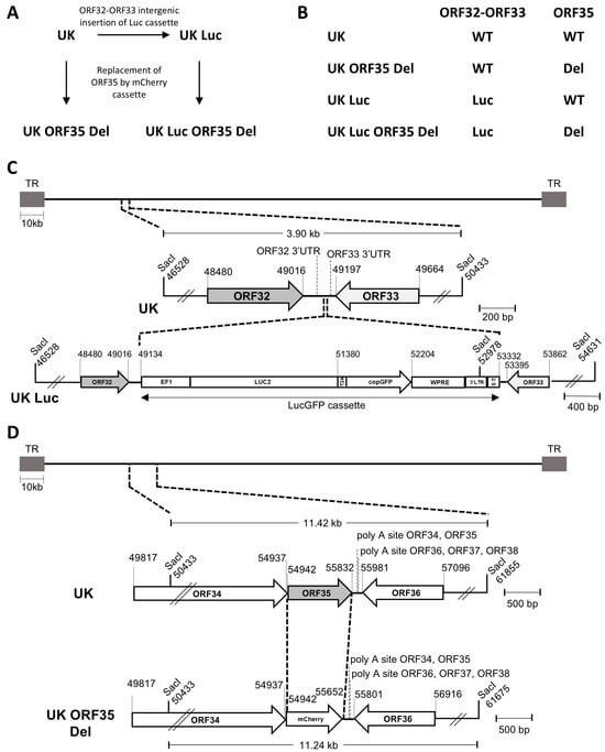 Schematic representation of the strategy used to produce AngHV-1 recombinants by homologous directed recombination (HDR). (A) Flowchart of the production of the UK Luc and ORF35 Del recombinant strains by HDR in eukaryotic cells. (B) Genotype of the UK parental strain and derived recombinant strains for the ORF32–ORF33 intergenic region and the ORF35 locus. WT, wild-type; Luc, inserted LucGFP cassette; Del, deleted. (C) A schematic representation of the genome structure of UK Luc. The genome of AngHV-1 flanked by two terminal repeats (LTR and RTR) and the intergenic ORF32–ORF33 genome region are shown at the top. (D) Schematic representation of the genome structure of the UK ORF35 Del recombinant. The genome of AngHV-1 flanked by two terminal repeats (LTR and RTR) and the ORF35 genome region are shown at the top. In panels (C,D), SacI restriction sites and predicted restriction fragments (in kb) are shown. Coordinates are those of the AngHV-1 reference strain available in GenBank (accession number: MW580855.1).