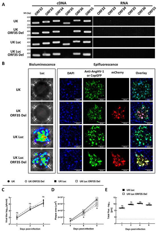 Characterization of AngHV-1 recombinant strains. (A) Transcriptional analysis of genes ORF32, ORF33, ORF34, ORF35, ORF36, and ORF55 expressed by the indicated strains of AngHV-1. ORF55 (AngHV-1 DNA polymerase) expression was used as a control. Marker sizes (MSs) in base pairs (bps) are indicated on the left. The left part and the right part of the figure represent the results of the PCR performed on cDNA and RNA, respectively. (B) Expression of reporter genes. EK-1 cells grown in 12-well plates were infected with the indicated strains, then overlaid with a medium containing CMC. At 4 dpi, infected cells were analyzed for the expression of bioluminescence and epifluorescence. The Luc signal was detected using the IVIS system (left frame). The reporters (copGFP and mCherry) and immunofluorescent staining (anti-AngHV-1) were detected by epifluorescent microscopy. Plaques of UK and UK ORF35 Del were revealed by indirect immunofluorescent staining (anti-AngHV-1) (right frame). (C) The replication kinetics and (D) viral plaque sizes of the ORF35-deleted strains were compared with those of the parental UK and UK Luc strains. (E) Luc expression of AngHV-1 recombinant strains (UK Luc and UK Luc ORF35 Del). The replication kinetic data represent the mean ± SEM of triplicate measurements. The data on the plaque area are the mean ± SEM of twenty measurements. The data on Luc expression are the mean ± SEM of triplicate measurements. The horizontal dashed line in panel E shows the mean + 3 SD of the data obtained for control non-infected cultures. Results of statistical comparisons between ORF35 Del strains and parental strains are indicated as follows: ns, no significant differences; *, p < 0.05.
