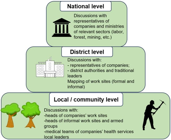 In parallel to the activities implemented to prepare for the reactive vaccination campaign targeting the general population, specific initiatives were taken to target high-risk workers (e.g., seasonal workers, miners, fishermen), including pygmies living and working mostly in the forest. Before organizing the vaccination campaign, it was essential to engage with representatives of the private sector, both formal and informal, in all key preparatory stages. The overall process to engage with private partners required interactions at the national and subnational levels (Figure 1).