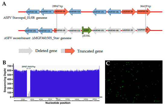 Generation of the ASFV recombinant ΔMGF360/505_Stav strain. (A) Scheme of the location of the MGF360/MGF505 gene deletion in the ASFV Stavropol_01/08 genome. (B) The recombinant ΔMGF360/505_Stav genome coverage plot using Illumina reads mapped to the ASFV Stavropol_01/08 genome. (C) Fluorescence microscopy of the primary culture of porcine macrophages infected with the ASFV recombinant ΔMGF360/505_Stav strain is shown. Scale bar indicates 100 μm.