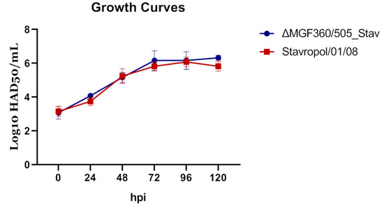 Comparative analysis of in vitro replication of the recombinant ΔMGF360/505_Stav strain (blue line) and the parental Stavropol_01/08 virus (red line) strain. The data are presented as the mean virus titer (expressed in log10 HAD50/mL) ± standard deviation (SD) at each point (0, 24, 48, 72, 96, and 120 h post-infection (hpi)).