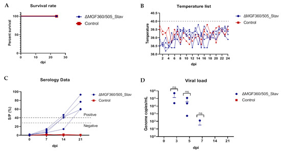 The safety and immunogenicity profile study of the ASFV recombinant ΔMGF360/505_Stav strain when inoculating pigs with 104 HAD50 per animal. The lethality kinetics (A), body temperatures (B), humoral immune response (C), daily viral loads in blood (D) in the pigs inoculated with the ASFV recombinant ΔMGF360/505_Stav strain (blue line) and control non-inoculated animals (red line). (B) The fever cutoff (40 °C) is marked as a gray dashed line. (C) The dashed lines represent the cut-off value, above which values were considered positive, below which were considered negative, and between them, there was a gray area where the values were considered doubtful. Data on body temperature, antibody response, and viral load are presented as individual values for each animal. dpi—days post-infection. ns—p > 0.05.