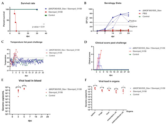 The efficiency of immunization with the ASFV recombinant ΔMGF360/505_Stav strain against the ASFV virulent parental Stavropol_01/08 strain when pigs were immunized with 104 HAD50 per animal and then challenged with 103 HAD50 per animal of the ASFV homologous Stavropol_01/08 strain (Experiment 2). The lethality kinetics (A), humoral immune response (B), body temperatures post-challenge (C), clinical signs post-challenge (D), daily viral loads in blood post-challenge (E), and post-mortem viral loads in organs (F) in pigs immunized with the ASFV recombinant ΔMGF360/505_Stav strain, infected with the Stavropol_01/08 strain (blue line), non-immunized animals, infected with the Stavropol_01/08 strain (red line), and control non-inoculated animals (green line). (B) The dashed lines represent the cut-off value, above which values were considered positive, below which were considered negative, and between them, there was a gray area where the values were considered doubtful. (C) The fever cutoff (40 °C) is marked as a gray dashed line. Data on body temperature, clinical assessment, antibody response, and viral load are presented as individual values for each animal. dpi—days post-immunization; dpc—days post-challenge. * p < 0.05.