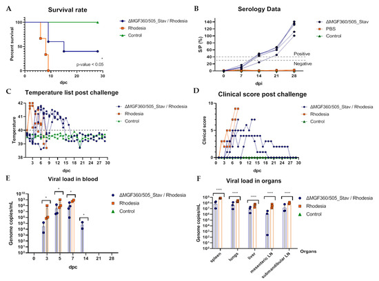 The efficiency of immunization with the ASFV recombinant ΔMGF360/505_Stav strain against the ASFV virulent Rhodesia strain, when pigs were immunized with 104 HAD50 per animal and then challenged with 103 HAD50 per animal of the ASFV heterologous Rhodesia strain (Experiment 3). The lethality kinetics (A), humoral immune response (B), body temperatures post-challenge (C), clinical signs post-challenge (D), daily viral loads in blood post-challenge (E), and post-mortem viral loads in organs (F) in pigs immunized with the ASFV recombinant ΔMGF360/505_Stav strain, infected with the Rhodesia strain (blue line), non-immunized animals, infected with the Rhodesia strain (orange line), and control non-inoculated animals (green line). (B) The dashed lines represent the cut-off value, above which values were considered positive, below which were considered negative, and between them, there was a gray area where the values were considered doubtful. (C) The fever cutoff (40 °C) is marked as a gray dashed line. Data on body temperature, clinical assessment, antibody response, and viral load are presented as individual values for each animal. dpi—days post-immunization; dpc—days post-challenge. * p < 0.05; **** p < 0.0001.