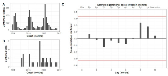 Comparison of the time trends of the rubella cases (panel A) and laboratory-confirmed congenital rubella syndrome (CRS) cases (panel B) in Sudan from January 2014 to December 2017. Panel C shows the cross-correlogram of the lag in CRS cases occurring following peaks in rubella cases. This figure indicates a positive (though not statistically significant, within the 95% confidence interval illustrated between the red lines) correlation with a lag of 8–10 months, corresponding to an increase in CRS cases following rubella cases occurring between conception and the third month of gestation.