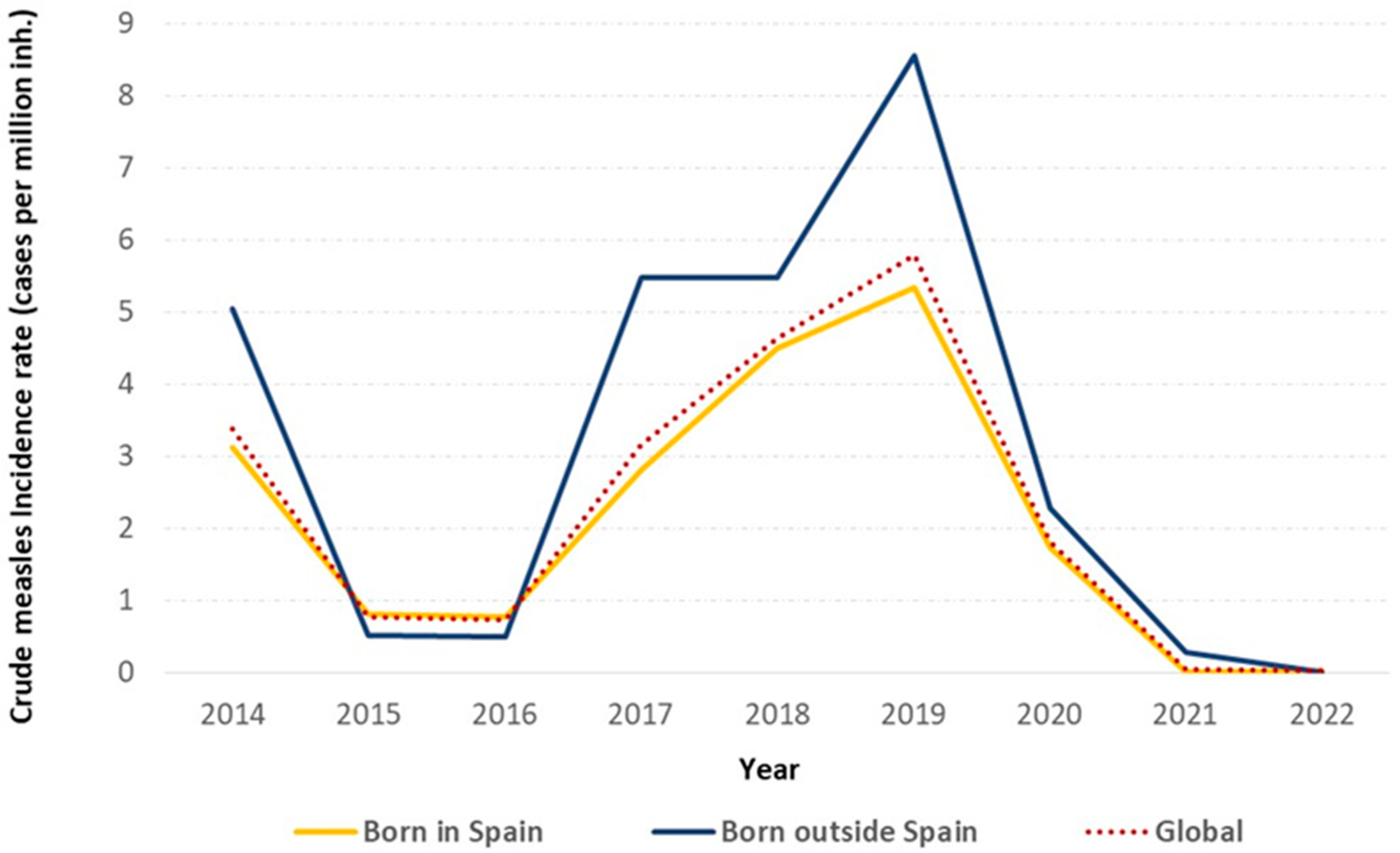 López-Perea N, López-Cuadrado T, Fernández-García A, Echevarría JE, Masa-Calles J. Measles Among the Foreign-Born Population Residing in Spain, 2014–2022: Missed Opportunities for Vaccination. Vaccines. 2024; 12(12):1452. https://doi.org/10.3390/vaccines12121452