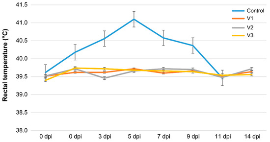 After challenging the control group, their average rectal temperature increased from 39.2 °C to 41.0 °C, whereas the peak temperature was >41 °C at 5 dpi and remained at 40.4 °C up to 11 dpi.