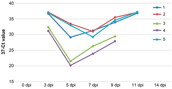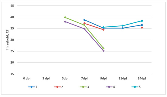 Dynamics of the detection of PPRV RNA in the blood of the control group (unvaccinated and challenged) via RT-PCR during the experiment.