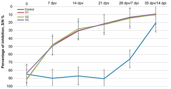 Before vaccination and at 7, 14, and 21 dpv, antibodies against the viral nucleocapsid protein (N) were determined in animals of the experimental groups (V1–V3) using a commercially available ELISA kit (IDVET). On the day of vaccination (day 0), all animals were seronegative for anti-N antibodies. In general, all vaccines induced antibodies against the N-protein (Figure 4). A week after vaccination, the animals of all three groups had equivalent levels of detectable specific antibodies, which increased 2 weeks after vaccination and then persisted for the rest of the study period (Figure 4). On the day of infection (3 weeks after vaccination), the level of antibodies in the range of 21.4–22.6% of inhibition was observed in all experimental group animals (V1–V3).