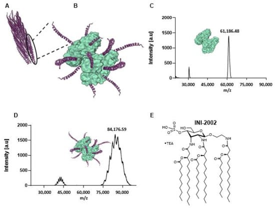 To further enhance the immunogenicity of the vaccine, we selected a synthetic TLR4 agonist as the adjuvant. Previous studies identified the importance of lipopolysaccharide (LPS) engagement of TLR4 in the clearance of Pa infections [21], and thus we hypothesized that the use of a TLR4 agonist would enhance an antibody response specific to CoaB. A component of LPS, Lipid A, is the bioactive element and is the structural basis of our synthetic TLR4 agonist, INI-2002 (Figure 1E) [13,22].