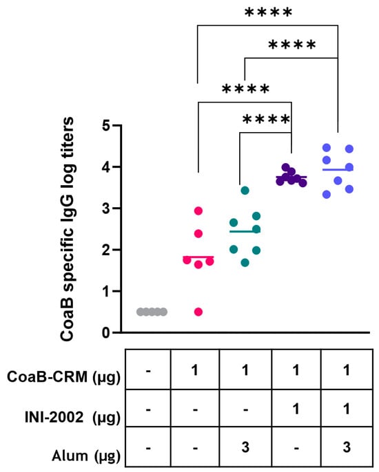 INI-2002 adjuvanted CoaB-CRM results in higher CoaB-specific titers compared to alum adjuvanted CoaB-CRM. C57BL/6 mice (6 or 7 per group) were injected once on days 0 and 14 i.m. with 1 µg/mouse. CRM-CoaB conjugate vaccine adjuvanted with 1 µg/mouse INI-2002 and/or with the indicated dose of alum. Serum was collected on day 14 post-secondary vaccination. CoaB peptide-specific IgG antibody titers were measured by ELISA. The symbols above individual points denote statistical significance. Pink circles represent individual mouse CoaB specific antibody titers from CoaB-CRM group, green circles are CoaB-CRM + alum, purple circles are CoaB-CRM + INI-2002, blue circles are CoaB-CRM + INI-2002 + alum. Line indicates the mean titer for each group. Ordinary one-way ANOVA followed by Fisher’s LSD was used to determine statistical analysis, where **** p ≤ 0.0001.