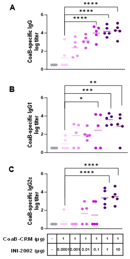 Anti-CoaB IgG, IgG1, and IgG2c antibody titers increase in a dose-dependent manner. C57 Bl/6 mice (5 per group) were injected once on days 0 and 14 i.m. with 1 µg/mouse CRM-CoaB conjugate vaccine adjuvanted with INI2002 as indicated. Serum was collected on day 14 post-secondary vaccination. CoaB peptide-specific IgG (A), IgG1 (B), and IgG2c (C) antibody titers were measured by ELISA. Circles represent individual mouse CoaB specific antibody titers and the shade of purple indicates increasing dose of INI-2002 from 0.0001 to 10 ug. Line indicates the mean titer for each group. The symbols above individual points denote statistical significance. Ordinary one-way ANOVA followed by Fisher’s LSD were used to determine statistical analysis, where * p ≤ 0.05, ** p ≤ 0.01, *** p ≤ 0.001, and **** p ≤ 0.0001.
