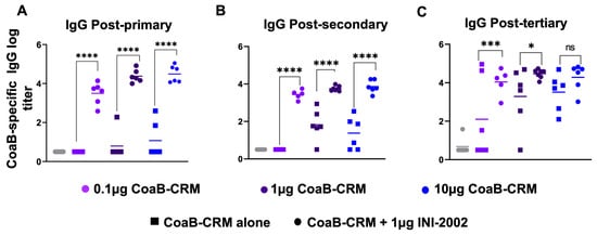 To determine if INI-2002 has an antigen dose-sparing effect and identify the optimal dose of CoaB-CRM, mice were vaccinated with 0.1 µg, 1.0 µg, or 10 µg of CoaB-CRM with or without 1 µg of INI-2002. Serum was collected at 14 days following the primary, secondary, or tertiary vaccination to assess anti-CoaB antibody titers. Mice that received INI-2002 in combination with 0.1, 1, or 10 µg of CoaB-CRM exhibited a statistically significant (p < 0.0001) increase in anti-CoaB IgG antibody titers following a primary or secondary vaccination compared to dose-matched mice that received antigen alone (Figure 4A,B). After three vaccinations, the addition of INI-2002 to CoaB-CRM results in a statistically significant boost when 0.1 or 1 µg of CoaB-CRM is used when compared to unadjuvanted dose-matched controls. However, the increase measured with 10 µg of CoaB-CRM plus 1 µg of INI-2002, following three vaccinations, did not reach significance (Figure 4C) when compared to the respective unadjuvanted group, suggesting a plateau in antibody response and corresponding loss of adjuvant impact. The 0.1 µg dose of CoaB-CRM plus INI-2002 resulted in significantly (p < 0.0001 post-primary, p < 0.0001 post-secondary) higher serum antibody titers compared to the 10 μg dose of CoaB-CRM (no adjuvant) post-primary and post-secondary but not post-tertiary. These data demonstrate at least a 100-fold antigen dose-sparing effect with the addition of the INI-2002 adjuvant. Since 1 µg of CoaB-CRM in combination with 1 µg of INI-2002 resulted in significantly increased CoaB-specific antibody titers following a primary, secondary, or tertiary vaccination compared to antigen alone, this dose was selected as the lead vaccine formulation for further development.