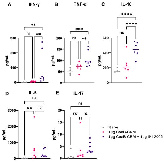 INI-2002, in combination with the CoaB-CRM antigen, promotes cell-mediated immunity to CoaB-CRM. 5 days post-secondary vaccination, mice were euthanized, and spleens were harvested, disaggregated, and restimulated with 5 µg/mL of CoaB-CRM. The following cytokines: IFNγ (A), TNFα (B), IL-10 (C), IL-5 (D), and IL-17 (E) were measured by an MSD cytokine array. Grey circles represent cytokine levels from individual naïve mice, pink circles are from CoaB-CRM vaccinated mice, purple circles are CoaB-CRM + INI-2002 vaccinated mice. Line indicates the mean titer for each group. Ordinary one-way ANOVA followed by Fisher’s LSD were used to determine statistical analysis, where ** p ≤ 0.01, *** p ≤ 0.001, and **** p ≤ 0.0001.