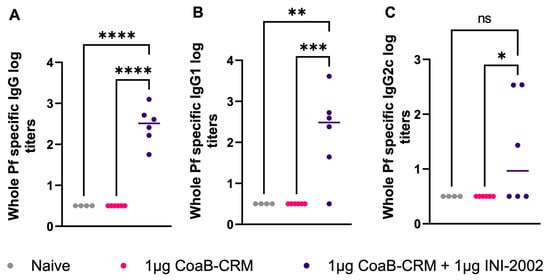 Vaccination with CoaB-CRM + INI-2002 produces whole-phage-specific antibodies. Mice were vaccinated, IM, with 1 µg CoaB-CRM and 1 µg INI-2002 or 1 µg of CoaB-CRM alone on days 0 and 14. Mice were bled on day 28, and serum antibody titers against whole Pf virions were measured by ELISA. Whole-phage-specific (A) IgG, (B) IgG1, and (C) IgG2c antibody titers were measured. Grey circles represent anti-phage titers from individual naïve mice, pink circles are from CoaB-CRM vaccinated mice, purple circles are CoaB-CRM + INI-2002 vaccinated mice. Line indicates the mean titer for each group The symbols above individual points denote statistical significance. Ordinary one-way ANOVA followed by Fisher’s LSD were used to determine statistical analysis, where * p ≤ 0.05, ** p ≤ 0.01, *** p ≤ 0.001, and **** p ≤ 0.0001.