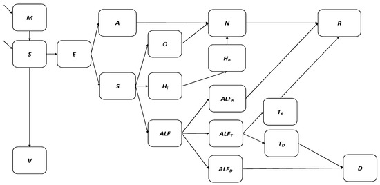 Figure 1 depicts the hepatitis A dynamic transmission model where the South African population is divided into 18 distinct hepatitis-A specific epidemiological compartments. Births are classified according to the presence of maternal antibodies into the M and S compartments. The V compartment represents hepatitis A vaccination. Hepatitis A infection occurs in the E compartment. The A (asymptomatic) and Sy (symptomatic) compartments represent active hepatitis A infections. The O and Hi compartments represent the treatment sought for uncomplicated hepatitis A cases, while the ALF compartment represents the treatment sought for viral-induced acute liver failure. Acute liver failure cases spontaneously recover from liver injury into compartment ALFR, indicate the need for liver transplant and move into compartment ALFT, or die due to liver injury without transplant in compartment ALFD. Liver transplant cases recover in compartment TR or die following the transplant procedure in compartment TD. The N compartment represents previous hepatitis A cases with anti-HAV IgG antibodies that may still have present anti-HAV IgM antibodies while R represents fully recovered hepatitis A cases with anti-HAV IgG antibodies and no anti-HAV IgM antibodies. Lastly, D represents all death due to hepatitis A infection.