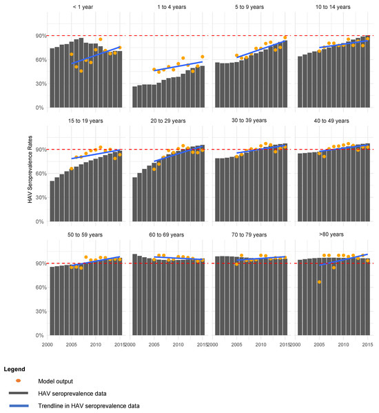 Model fitting to HAV seroprevalence (anti-HAV IgG) data by age group.