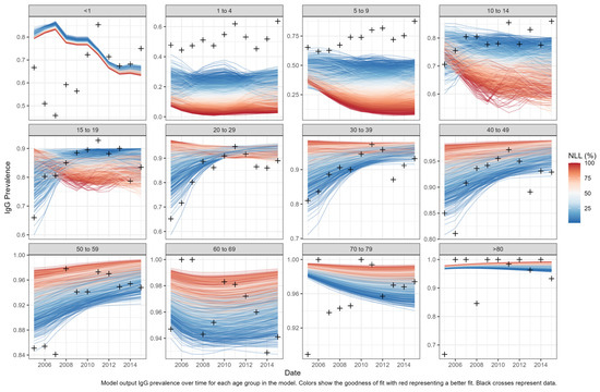 Model calibration negative log likelihood results. Model output IgG prevalence over time for each age group in the model. Colors show the goodness of fit with red representing a better fit. Black crosses represent data.