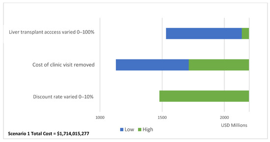 Our one-way sensitivity analysis on the total cost of Scenario 1 reported in Figure 4 shows that varying access to liver transplant between 0% and 100% has the largest impact in results (total cost delta = USD 609,302,599). When increasing the access to liver transplant to 100% for baseline and Scenario 1, the ICER for Scenario 1 becomes cost-effective against the CET (ICER = USD 2425) (Supplementary Table S4).