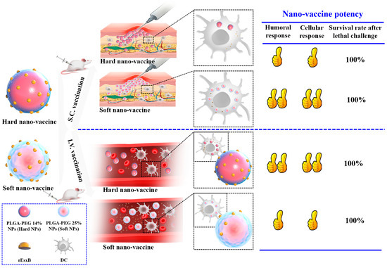 In the present work, we took S. aureus as a model system, due to its growing impact on public health resulting from the emergence and spread of methicillin-resistant S. aureus (MRSA) strains. In fact, the emergence of drug-resistant strains urged the search for alternative treatments such as immunotherapeutic approaches. Here we fabricated both soft and hard PLGA-based NPs as carriers for an S. aureus antigen (i.e., recombinant ess extracellular B (rEsxB)) [20] and the medium for adjuvanticity (Figure 1). We discovered that tuning the stiffness of the carrier materials by modulating the carrier composition promoted the cellular uptake of rEsxB-carrying NPs, but at the same time affected the decomposability of the NPs (and thus rEsxB release). In the mouse group receiving a S.C. vaccination, a significantly higher rEsxB-specific antibody titer was found in mice treated with a soft nano-vaccine, while similar results were obtained in mouse groups receiving a I.V. vaccination but with a hard nano-vaccine. For vaccination via S.C. and I.V. alike, the NP-based S. aureus vaccines show excellent protection for mice against S. aureus lethal challenge, and their survival rates are 100% after the inoculation of ATCC25923 strain, being far superior to the clinically used Alum adjuvant.