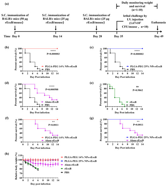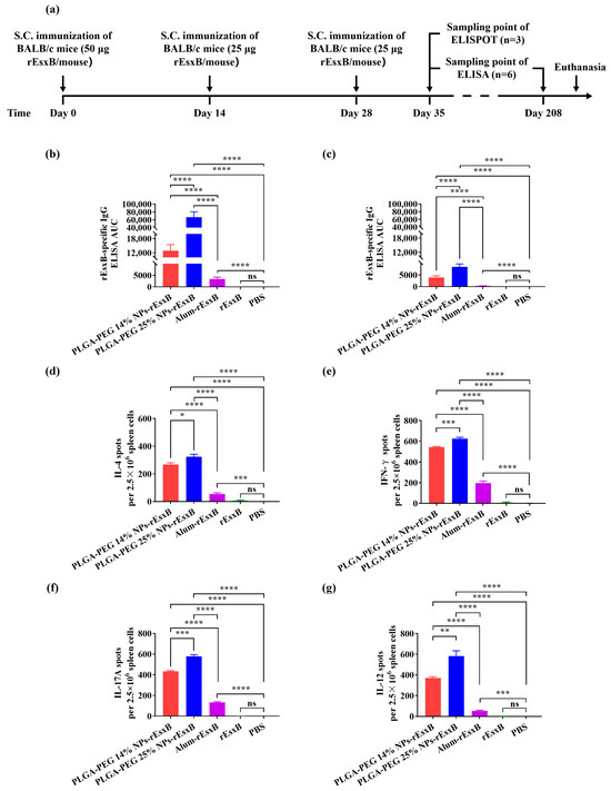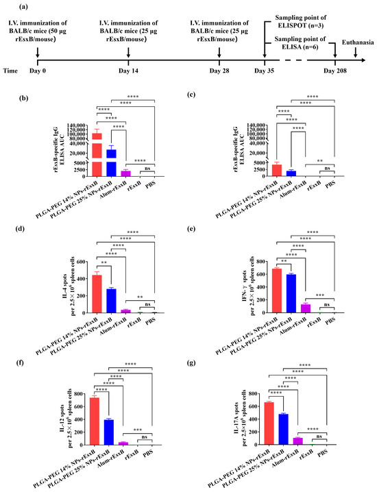 BL21 (DE3)-competent Escherichia coli (E. coil) was purchased from TIANGEN BIOTECH (BEIJING) Co., Ltd. (Beijing, China). Ni-Sepharose was purchased from Cytiva (Shanghai, China). A High-Capacity Endotoxin Removal column was purchased from Xiamen Bioendo Technology Co., Ltd. (Xiamen, China). PLGA-PEG X% polymers (X = 0, 14, 20, 25, 33, PLGA with a lactic acid to glycolic acid ratio of 50:50) and fluorescein isothiocyanate (FITC)-PEG2000-NH2 were purchased from Xi’an Ruixi Biological Technology Co., Ltd. (Xi’an, China). Isopropylbeta-D-thiogalactopyranoside (IPTG), imidazole, polyvinyl alcohol (PVA), dichloromethane (DCM), acetone, 2-(N-morpholino) ethanesulfonic acid hydrate (MES), 1-ethyl-3-(3-dimethylaminopropyl)-carbodiimide (EDC), N-Hydroxysuccinimide (NHS), bovine serum albumin (BSA), Tween 20, 2,2′-azino-bis (3-ethylbenzothiazoline-6-sulfonic acid) (ABTS), horseradish peroxidase (HRP)-labeled goat anti-mouse IgG, and 0.22 μm and 0.45 μm sterile filters were purchased from Merck (Shanghai, China). Imject™ Alum adjuvant was purchased from Thermo Fisher Scientific (Waltham, MA, USA). Ninety-six-well polystyrene plates for the enzyme-linked immunosorbent assay (ELISA) were purchased from Corning (New York, NY, USA). Enzyme-linked immunospot (ELISPOT) kits were purchased from Mabtech (Stockholm, Sweden). All other solvents are of analytical grade and were used without further purification.