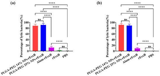Standard Neisser–Wechsberg bacteriolysis evaluation [30] was employed to investigate the bacteriolysis effects of the antibody in all nano-vaccines, namely the Alum-rEsxB, rEsxB and PBS groups, with some modifications. The S. aureus ATCC 25923 strain was cultured until reaching the mid-exponential phase (OD600 = 0.5), then the S. aureus concentrations were adjusted to 3 × 106 CFU/mL with PBS (pH 7.4). The serum of immunized mice and normal guinea pig serum were added to the S. aureus at a final concentration of 2% (v/v), respectively. The mixture was incubated at 37 °C for 0.5 h, plated on LB agar plates and incubated overnight at 37 °C. Finally, the number of colony-forming units of S. aureus was counted and the percentage of lytic bacteria was calculated using the following formula: