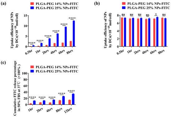 Cellular uptake efficiency of PLGA-PEG X% NPs-FITC at (a) a high feeding concentration of 2 mg/mL and (b) a low feeding concentration of 10 μg/mL. (c) In vitro cumulative FITC release behavior of PLGA-PEG X% NPs-FITC was studied in 50% FBS at 37 °C. The release of FITC was quantified in triplicate wells for each group. All data are expressed as the means ± S.D. p values < 0.05 were considered as statistically significant (* p < 0.05; **** p < 0.0001).