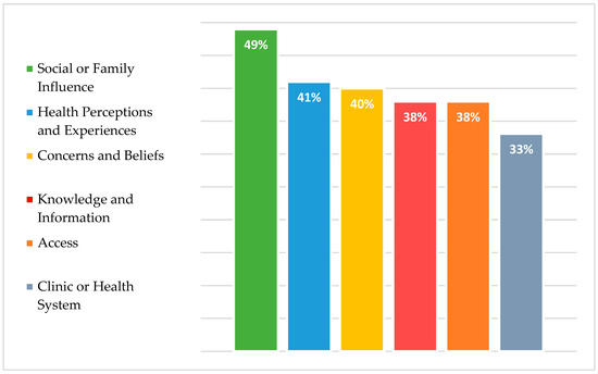 Across the six broad categories, the most commonly reported perceived barriers by our cohort were primarily linked to social and family influence (48.9%), closely followed by perceptions about one’s health and vaccines (40.5%), and concerns and beliefs regarding immunization (40.4%). Additionally, lack of information and proper knowledge (38.2%), difficulties in accessing healthcare (38%), as well as various barriers related to the healthcare system and facilities (33.1%) were also reported (refer to Figure 1).