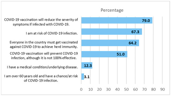 Figure 1 shows the reasons for COVID-19 vaccine acceptance. The three main reasons were believing that vaccination could reduce COVID-19 symptom severity, understanding the risk of contracting COVID-19, and recognizing the need to achieve herd immunity. Table 2 shows COVID-19 vaccine hesitancy and the respective number of participants who have those reasons. The top three reasons were that the participants wanted a well-tested COVID-19 vaccine, were concerned about vaccine safety, and preferred to wait for a more effective vaccine.