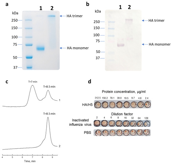 (a) Electrophoretic mobility of HA/H5 under denaturing (1) and under non-denaturing conditions (2). (b) Western blot analysis of the recombinant HA/H5 using ferret H5N8 serum under denaturing (1) and under non-denaturing conditions (2). (c) Gel chromatogram of purified HA/H5 protein (1) and BSA (2). (d) Hemagglutination assay using the HA/H5 recombinant protein. Inactivated A/turkey/Stavropol/320-01/2020 (H5N8) influenza virus was used as a positive control. PBS was used as a negative control.