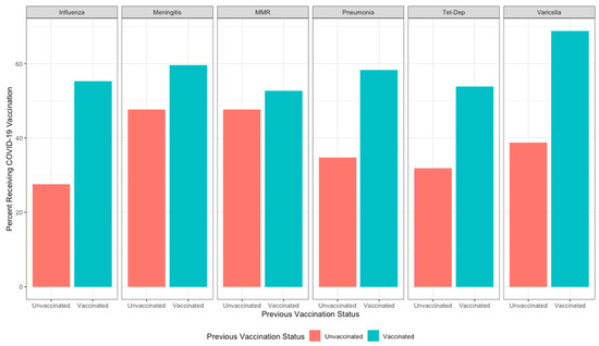 Cross-tabulations of six common adult immunizations with current COVID-19 vaccination status indicated higher vaccination for COVID-19 among those who have previous immunization for influenza (55.2%), pneumonia (58.3%), tetanus-diphtheria (53.8%), varicella (68.8%), meningococcal (59.6%), and MMR (52.7%) (all p < 0.0001) compared to those who do not have a record of a previous immunization (Figure 2).