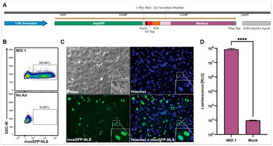 Overview of the HAdV-C5-based reporter vector and its multiple readout options. HepG2 cells were transduced with the HAdV-C5-base reporter vector at an MOI of one infectious particle/cell, and the expression of the reporter proteins was analyzed 96 h post-transduction. (A) The expression cassette of the HAdV-C5-based reporter vector. A murine transthyretin (TTR) promoter drives moxGFP, which is fused to a c-Myc nuclear localization signal (NLS) and connected to a NanoLuc luciferase, which is fused to an N-terminal IL-6 secretion signal. Both reporter proteins are connected via a linker region containing a Furin cleave site, a V5-Tag, and a P2A site. (B) moxGFP expression and the percentage of moxGFP-positive cells can be analyzed via flow cytometry. (C) moxGFP expression and moxGFP-positive cells can also be monitored via fluorescence microscopy. Through the fused NLS, moxGFP is localized in the nucleus, leading to an improved signal-to-noise ratio and allowing an easy quantification of transduced cells. (D) HAdV-C5-based reporter vector transduction (N = 12) can also be monitored via the NanoLuc expression level through luminescence analysis. Statistical analysis was performed using the t-test. **** p < 0.0001.