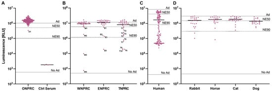 Screening of neutralizing antibodies against the HAdV-C5-based reporter vector. The established HAdV-C5 neutralization assay was performed with serum samples (A) drawn by routine examinations from rhesus macaques at the ONPRC colony, (B) received from different US-based national primate research centers, (C) from humans, and (D) from non-primate species. The indicated lines represent controls of non-pretreated HAdV-C5-reporter vector (Ad), non-transduced cells (No Ad), 50% neutralization efficiency (NE50), and 90% neutralization efficiency (NE90).