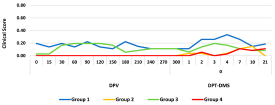 Furthermore, during the vaccination period, the clinical scores of all the groups remained below 0.2. After treatment with DMS, a slight increase to 0.33 in the clinical score was observed only in group 3 on DPT-DMS 4 (Figure 2).