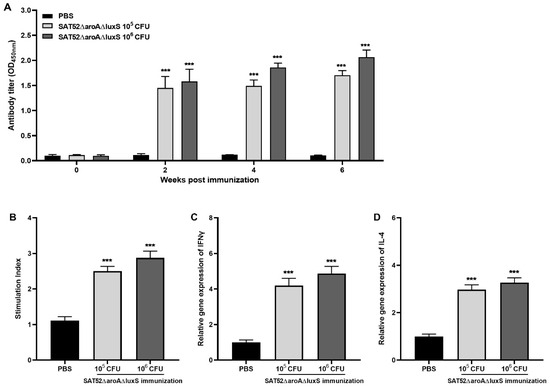 The cellular immune responses were evaluated by splenic lymphocyte proliferation assay and cytokines’ mRNA levels. As shown in Figure 3B, the stimulation index of both immunized groups were significantly higher than that of PBS group after stimulation with the SAT52 whole-cell lysate (p < 0.001). This indicated that SAT52ΔaroAΔluxS induced the development of memory lymphocytes, whose replication could be prompted upon corresponding antigens stimulation. In the SAT52ΔaroAΔluxS immunization group, the relative mRNA level of IFN-γ was upregulated by more than four-fold that of the PBS group. The relative mRNA level of IL-4 was upregulated around three-fold. Similarly to humoral responses, a higher immunization dose induced higher levels of cytokines’ mRNA (Figure 3C,D). This indicated that the immunization successfully established T-cell immunity responses.