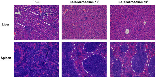 Histopathological examination showed that no obvious pathological lesions were observed in the liver or spleen of immunized mice. However, in the liver of PBS group, filtration of inflammatory cells and formation of inflammatory foci were observed (indicated by arrows, Figure 5). The spleen of PBS group mice exhibited excessive reticular tissue proliferation and inflammatory cell filtration, disrupting the boundary of red and white pulps which could be clearly seen in the spleen of immunized mice (indicated by dashed lines, Figure 5). Taken together, SAT52ΔaroAΔluxS conferred protection against wild-type SAT52 and avoided the pathological damage caused by challenge.