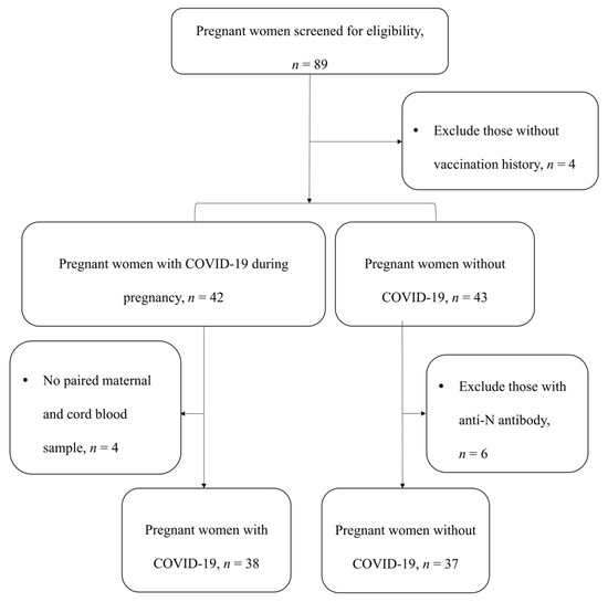 Between 6 June 2022 and 20 September 2022, there were 89 women enrolled in this study. Four unvaccinated women were excluded. Of these, 42 women were either previously diagnosed with COVID-19 during pregnancy or had a positive RT-PCR result of SARS-CoV-2 in nasopharyngeal samples upon admission. Four women had no paired samples of maternal and cord blood and were excluded as a result. There were 43 women without a prior history of COVID-19. Six women were excluded due to the detection of the anti-N antibody, indicating previous unrecognized asymptomatic COVID-19. Ultimately, 75 maternal–cord pairs were included for analysis, consisting of 38 pairs from those with prior or current COVID-19 (the case group) and 37 pairs from those without COVID-19 (the control group) (Figure 1).