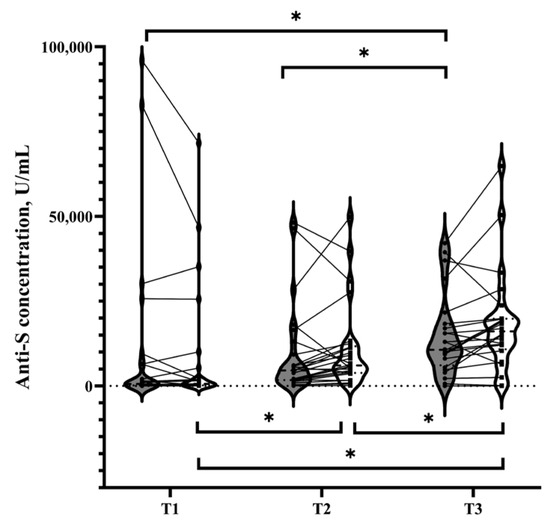 For the control group, the anti-S antibody titers of the maternal and cord blood were significantly higher in the T3 group (median 10,442.00 U/mL, IQR 9535.00–13,033.00 U/mL for maternal plasma; median 14,999.00 U/mL, IQR 12,085.00–19,042.00 U/mL for cord plasma) than in the T1 (median 264.15 U/mL, IQR 56.60–1075.98 U/mL for maternal plasma, p value < 0.001; median 269.80 U/mL, IQR 75.54–1819.75 U/mL for cord plasma, p value < 0.001) and T2 (median 2035.50 U/mL, IQR 1070.93–4912.75 U/mL for maternal plasma, p value < 0.001; median 5937.50 U/mL, IQR 2932.33–11,280.75 U/mL for cord plasma, p value = 0.006) groups, as shown in Figure A1a. However, the significance of the vaccination trimester regarding the anti-S antibody titers of maternal or cord blood was diminished in the case group (Figure A1b), which suggests a prominent impact of recent COVID-19 on the anti-S antibody titers (Tables S1 and S2).