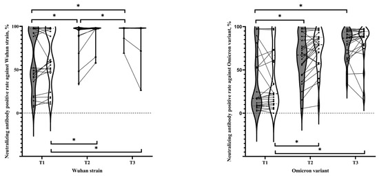 Violin plots and dot plots show humoral responses in pregnant women receiving the latest injection of a COVID-19 vaccine during different trimesters: neutralizing antibody concentrations of maternal (shown in gray; ●) and cord (shown in white; ■) blood against the Wuhan strain and Omicron variant in all pregnant women. Statistical significance was determined by the Mann–Whitney U test or the Bonferroni test. An asterisk (*) indicates a p value of <0.017. Abbreviations: T1, before pregnancy and during the first trimester; T2, during the second trimester; T3, during the third trimester.