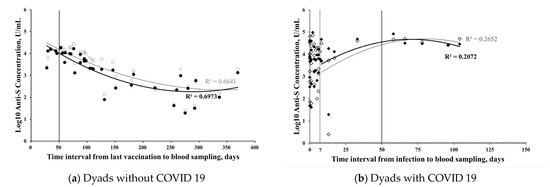 Scatter plots present (a) the correlation of transformed log10 concentrations of anti-S antibody in maternal (●, R2 = 0.6973) or cord blood (○, R2 = 0.6641), and the time interval between the latest injection of a COVID-19 vaccine and blood sampling from 37 mothers without SARS-CoV-2 infection; (b) the correlation of transformed log10 concentrations of anti-S antibody in maternal (◆, R2 = 0.2072) or cord blood (◇, R2 = 0.2652), and the time interval between the latest injection of a COVID-19 vaccine and blood sampling from 38 mothers with COVID-19.