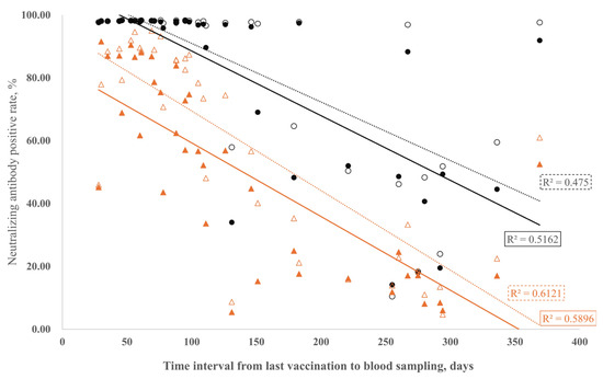 Scatter plots present the correlation of neutralizing antibody positive rate against Wuhan strain in maternal (●, R2 = 0.5162) or cord blood (○, R2 = 0.475), and the time interval between the latest injection of a COVID-19 vaccine and blood sampling; and the correlation of neutralizing antibody positive rate against Omicron variant in maternal (▲, R2 = 0.6121) or cord blood (△, R2 = 0.5896), and the time interval between the latest injection of a COVID-19 vaccine and blood sampling from 37 mothers without SARS-CoV-2 infection.